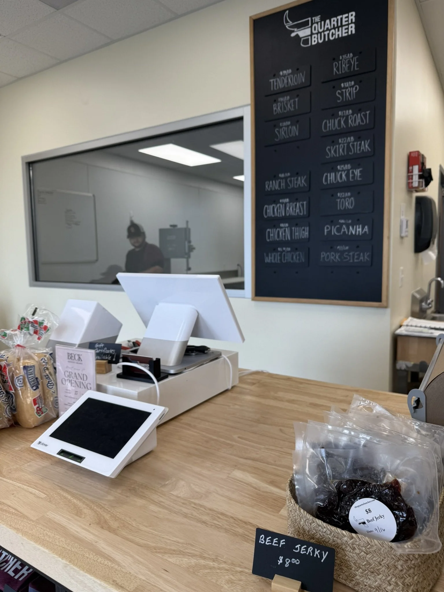 There is a window to our cut room so you can see exactly how your meat is prepared. We cut-to-order, so the sign next to the window tells you what we have available that may not be in the case.